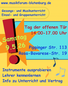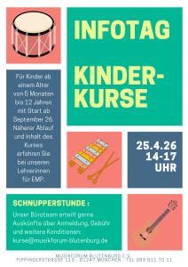 Der Gruppenunterricht/Zusammenspiel wird montags in der Pippinger Straße stattfinden und kann voraussichtlich ab Herbst 25 starten. Uhrzeit steht noch offen. Leihinstrumente sind Großteils vorhanden.